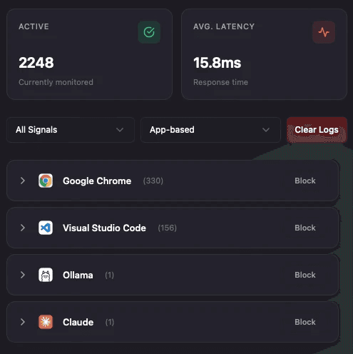 Detect which apps communicate with LLM, block unwanted traffic immediately and keep track of your past AI conversations.